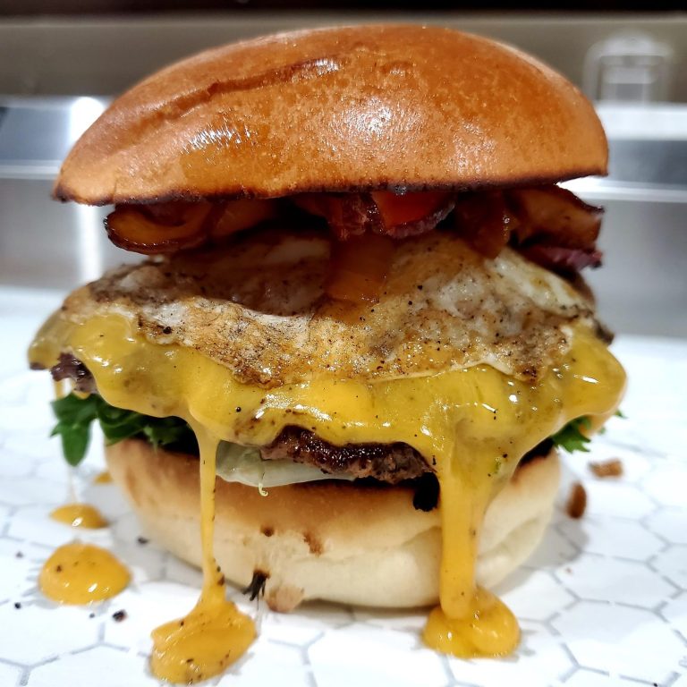 Two fresh patties with a splash of Worcestershire sauce, smashed and seared on the grill for deep, rich flavor. Served on a toasted brioche bun with pickles, smoked gouda cheese, sautéed onions, and finished with our signature house sauce. Everything that brings out that bold, unforgettable Wagyu flavor — made fresh to order.